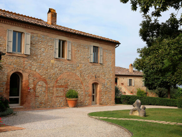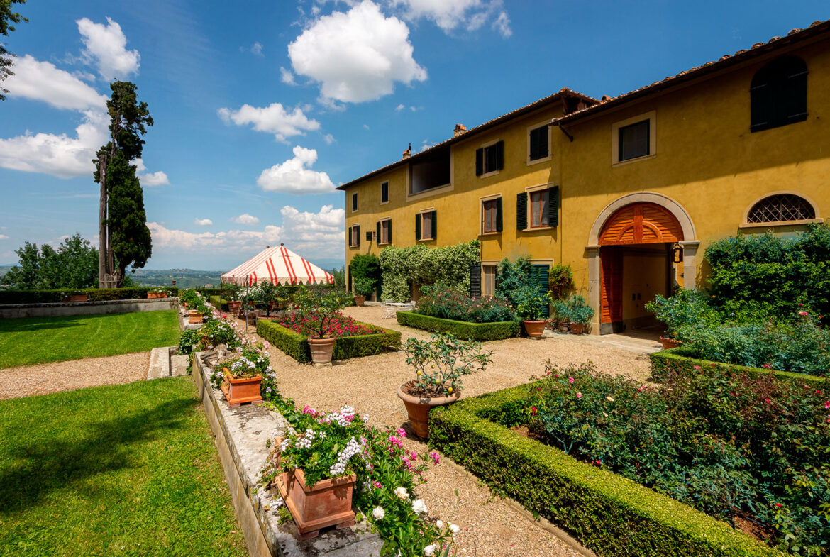 The Villa has been the residence of many illustrious Florentine families throughout the centuries, such as the Scolari, the family of the famous general Pippo Spano, and the Pitti, before becoming the property of the Medici family. By the mid-1500s, the current main building of Tizzano was rebuilt and expanded on the ruins of the ancient Villa. In 1585, it was donated by the Grand Duke Francesco de Medici to the well-known sculptor Giambologna, and on his death passed onto his pupil Pietro Tacca. The accommodation outside the Villa remained unchanged until 1793. During the Napoleonic era, the Villa was bought by Prince Talleyrand, until the second half of the 1800s when it was purchased by Count Roberto Pandolfini and his wife Beatrice dei Principi Corsini. Since then, the Villa is still owned by the Counts Pandolfini. In 1999, Elizabeth Pandolfini inherited the ownership of the Villa from her father and began a long work of restoration and enhancement, in order to bring the structure back to its former glory. The villa presents several ancient and precious common room areas, such as the Hall of Arms, the kitchen on the ground floor of the Tower, and the elegant living room, designed with the greatest care, in harmony with the traditions and taste of Tuscan houses. On the ground floor, the Ballroom beams, characterized by an elegant coffered ceiling, painted floor, and a large Renaissance fireplace. From here we enter the formal yellow sitting room. Next to it you find the nineteenth-century library that looks out, through two large French windows, onto the romantic garden. Here, guests can choose to lose themselves in a book, surrounded by the silence and peace of the countryside, while sipping a cup of tea, and accompanied, if desired, by background classical music. The ground floor is connected to the first floor by an ornate staircase, leading to the three superior rooms christened Contessa Mita, Conte Filippo, and Cielo. On the second floor is a living room equipped with treadmills, overlooking a loggia above the garden, and the four other bedrooms: Giulia and Liz Taylor (named after the actress who was once a guest here at the end of the fifties), both with a private restroom; La Verde and La Rosa rooms with a shared bathroom. The Villa’s ‘feather in its cap’ is the Federico suite, with refined eighteenth-century decorations and a 30 sqm bathroom. Whereas in the Tower room, situated in the medieval tower, even today you can still feel a fairy-tale atmosphere. Finally, the distinctiveness of the villa is completed by a beautiful botanical garden with solarium and infinity swimming pool surrounded by olive groves, from which you can enjoy a breathtaking view over the Chianti hills.